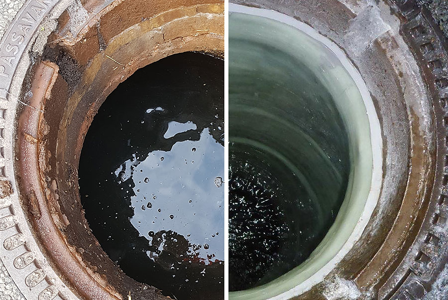 Im Oktober und November 2017, sowie im April 2018 haben wir 23 Schächte und ca. 200 Meter Anschlussleitungen saniert. Die Schachtbauwerke wiesen starke Betonkorrosion auf, stark infiltrierendes Grundwasser, Gerinne waren stark geschädigt, Anschlussleitungen waren inkrustiert, wiesen Versätze auf, stark eindringendes Grundwasser, Rissbildung etc.