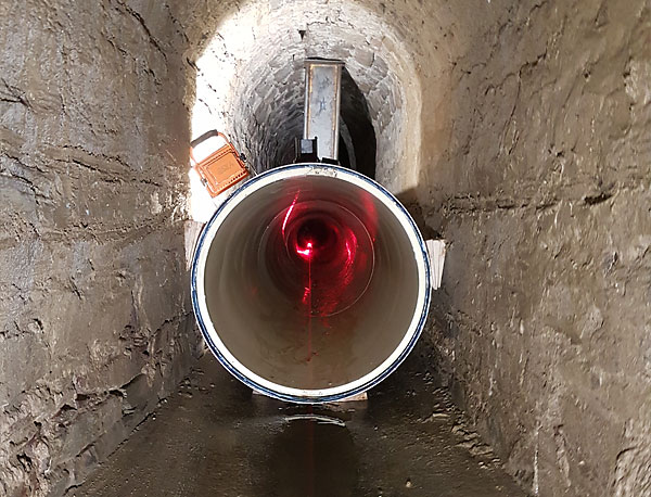 Die vorgefertigten Rohre werden über eine Baugrube in den vorhandenen Kanal eingelassen und mittels eines speziell von uns entwickelten Rohrwagen unterirdisch verfahren und in Höhe und Richtung ausgerichtet.